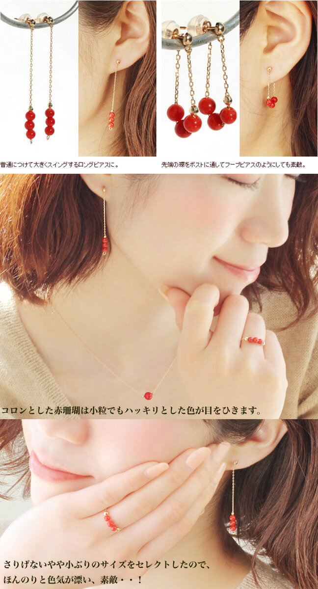 さりげないやや小ぶりのサイズをセレクトしたので、ほんのりと色気が漂い、素敵・・! 思わずシリーズでそろえたくなる可愛さ・・! 使用したのは、生命力溢れる紅色の赤珊瑚。